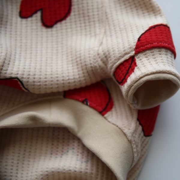 首リブが伸びて着崩れる事を防いだり、洋服が脱げるのを防止し、長く心地よく着て頂く為、ゴム紐を入れてあります。